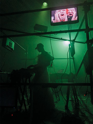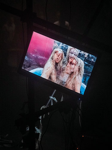 Scaffolding, monitors, raspberry pis, videos generated with stable diffusion.