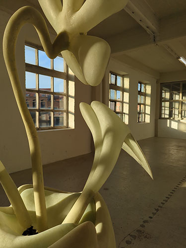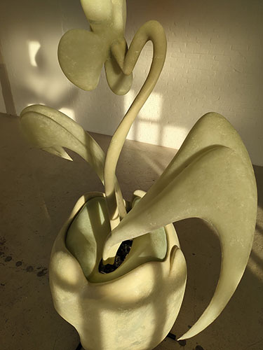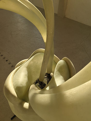 The sculpture’s silent sway harkens back to a time of early machines and their hypnotic wonder. Its shape is a direct reference to Flip Flap, a mass-produced toy automaton that gained a cult-following from the 90s onwards thanks to the animistic allure of its spontaneous movement. Here, the sculpture playfully blends aesthetics: the forceful lines and raw materiality of the modernist fine art object, the zaniness of Postmodernism, the geometrical accuracy of the digital model. Its composite aesthetics mark a break from the whimsical charm of the toy automaton it references. In a nod to the discursive flavour of our times, it now borrows from the language of the hyperbole. Stretched to a human scale, twisted around itself, sharpened at the tips, its mutated form casts a fleeting doubt onto the assumption of its harmlessness. Should we allow the machine to fascinate us so easily?